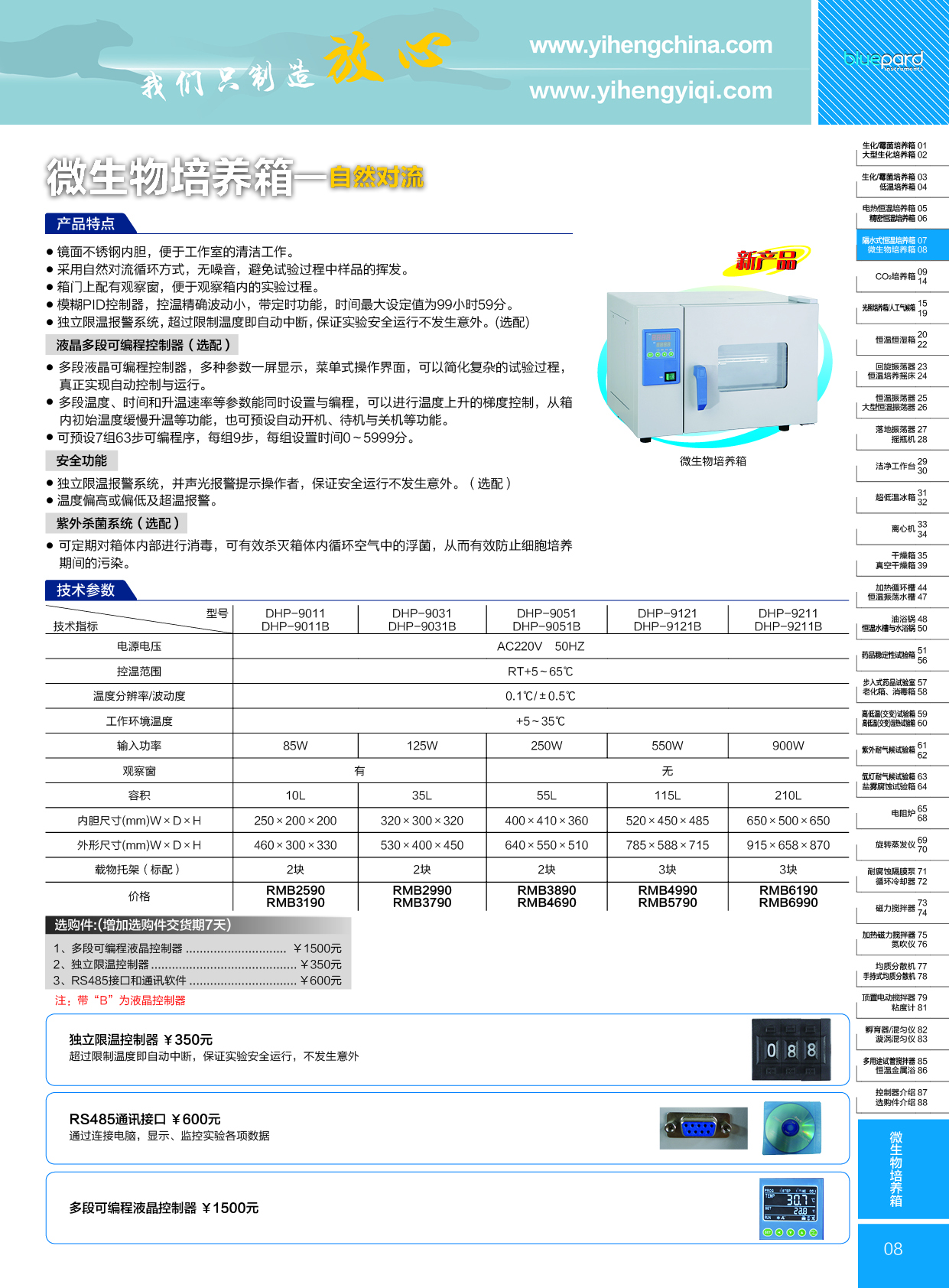 容積207L,控溫范圍室溫+5℃-200℃,溫度波動度±0.2℃;超溫聲光報警并自動切斷加熱電源;采用微電腦智能P.I.D.控制器;內置隔板可自動調節;擱板支架可自由裝卸